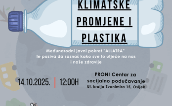PRONI Centar za socijalno podučavanje u sklopu ESS projekta organizira predavanje na temu “Klimatske promjene i plastika”. Predavanje će se održati u utorak 14. listopada od 12.00 do 13.30 sati …
