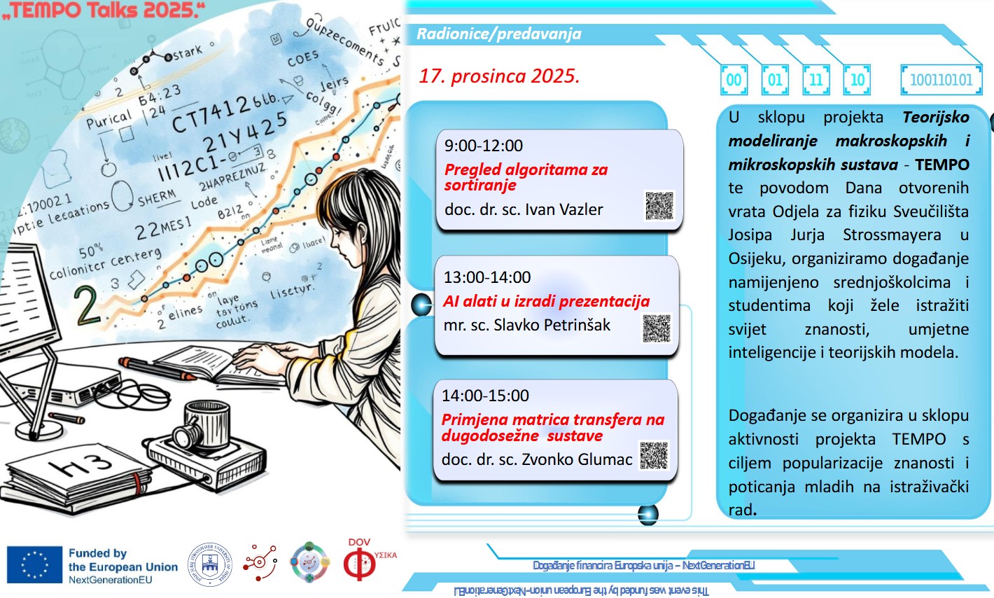 Odjel za fiziku Sveučilišta Josipa Jurja Strossmayera u Osijeku, u sklopu projekta TEMPO – Teorijsko modeliranje makroskopskih i mikroskopskih sustava te Dana otvorenih vrata Odjela, organizira radionice namijenjene srednjoškolcima, studentima i svim zainteresiranim građanima koji žele istražiti svijet znanosti, umjetne inteligencije i teorijskih modela. Događanje će se održati 17.12.2025. na adresi Trg Ljudevita Gaja 6, a sudionici će moći sudjelovati u tri tematske radionice: