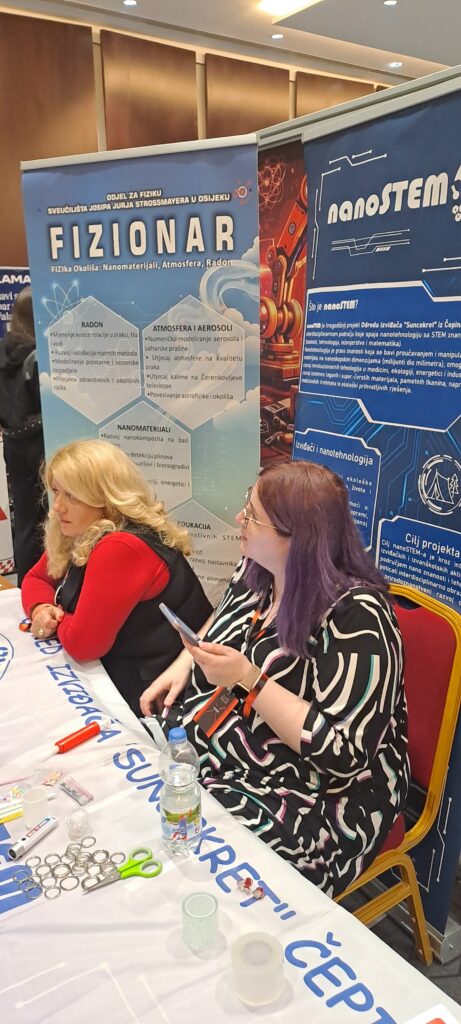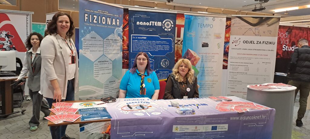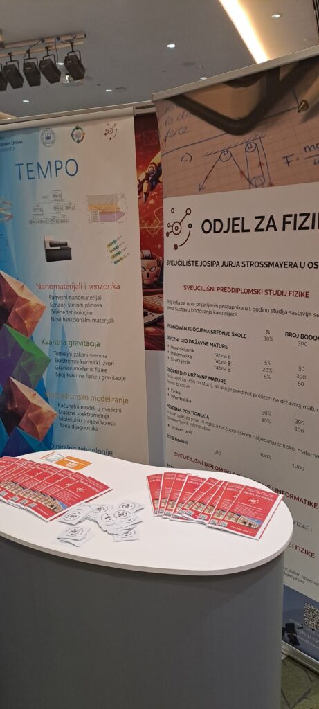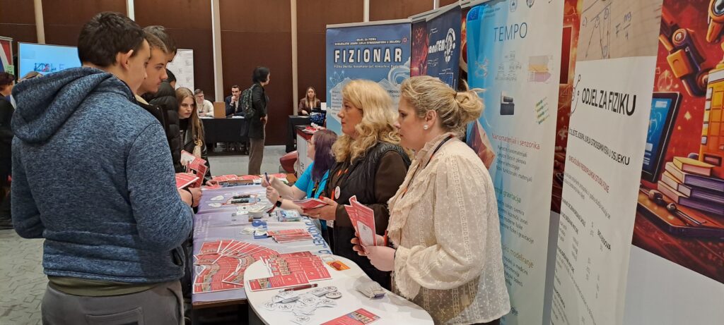 Naš Odjel predstavio se znanstveno‑istraživačkim projektom FIZIONAR (581‑UNIOS‑103), koji povezuje četiri istraživačka smjera: radioaktivnost u okolišu, funkcionalne nanomaterijale, astrofiziku i edukacijsku fiziku. Upravo na ovakvim manifestacijama nastojimo naglasiti transdisciplinarnost, održivost i primjenjivost naših istraživanja, pokazujući kako rezultati mogu doprinijeti razvoju znanosti, unapređenju obrazovanja i zaštiti okoliša. Kroz jednostavne, vizualno atraktivne i sigurne pokuse, multimedijske sadržaje te razgovore s nastavnicima i studentima fizike, posjetiteljima smo približili osnovne fizikalne pojmove, potaknuli ih da otkriju gdje se fizika „krije“ u umjetnosti, tehnologiji i svakodnevnom životu te ih ohrabrili da sami isprobaju demonstracijske pokuse.